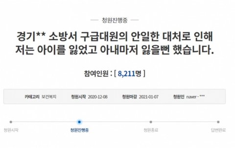 지난 8일 청와대 국민청원 게시판에는 '소방서 구급대원의 안일한 대처로 인해 저는 아이를 잃었고 아내마저 잃을 뻔했습니다'라는 청원이 올라왔다. 청원인은 지난 1일 산모 상태가 위중해 구급차를 불렀지만 구급대원들은 산모가 열이 나기 때문에 응급실에 갈 수 없다는 말만 반복했다고 주장했다.