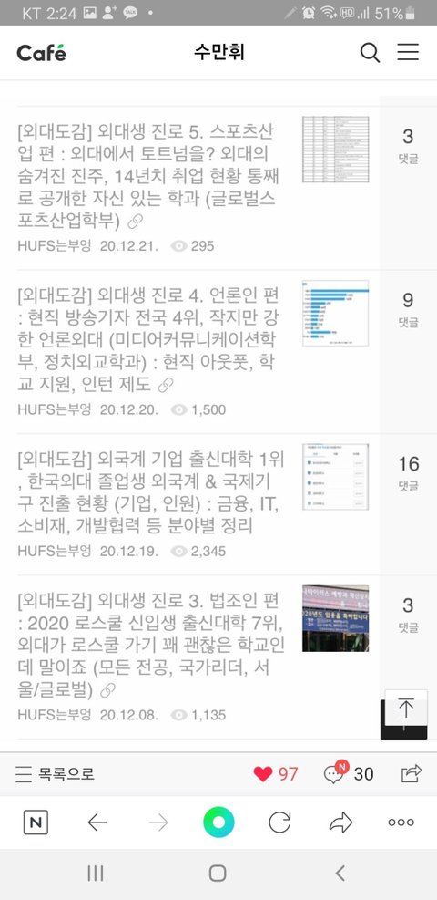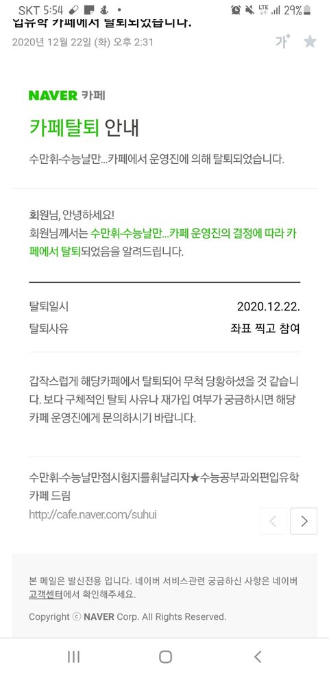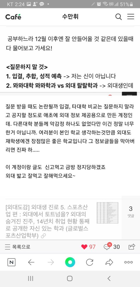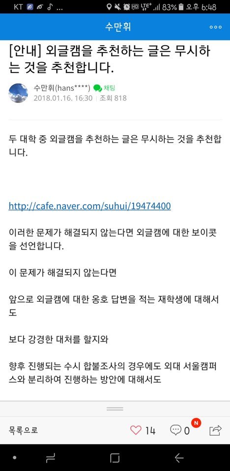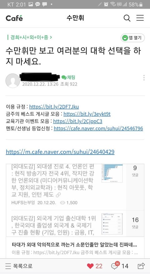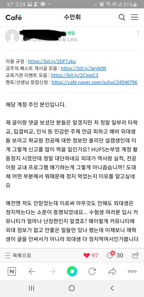 1. 입시사이트에서 한국외국어대학교 관련 정보글만을 썼던 작성자의 글이 삭제되고 카페 탈퇴당함(재가입도 불가하게 만들어버림)