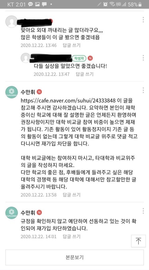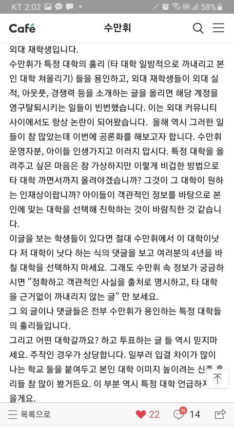 제가 이 글을 쓴 요지는 '수만휘'의 특정 대학에 대한 차별적 제재와 불공정한 기준의 게시글 삭제 및 강퇴등의 행위, 이로 말미암은 수험생들의 알 권리를 저해하려 한 점을 비판하고 이를 시정하기를 바란다 라는 것이었습니다.