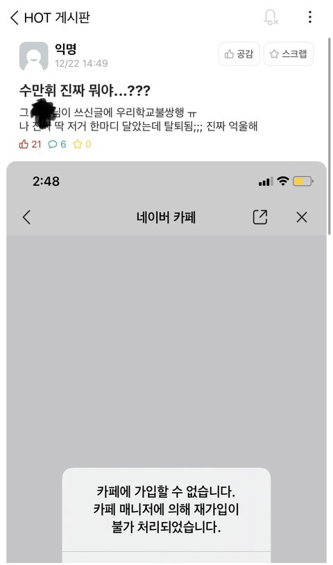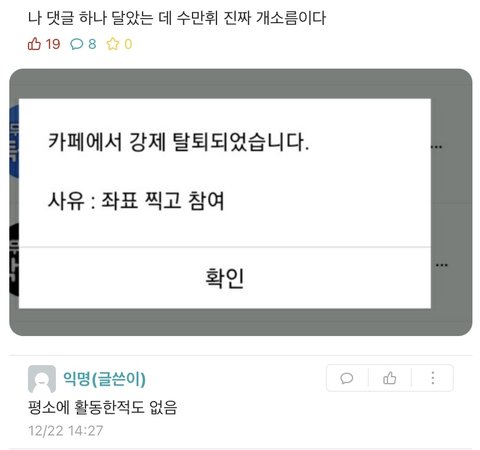 2. 작성자가 부계정으로 다시 글을 썼지만 운영진이 부계정마저 탈퇴시키고 글에 댓글 단 사람들도 탈퇴처리함