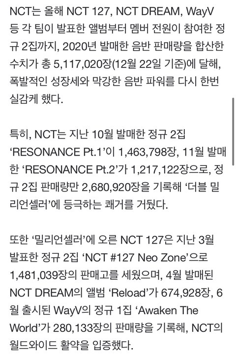 NCT 2020년 음반 판매량 511만장 돌파!!