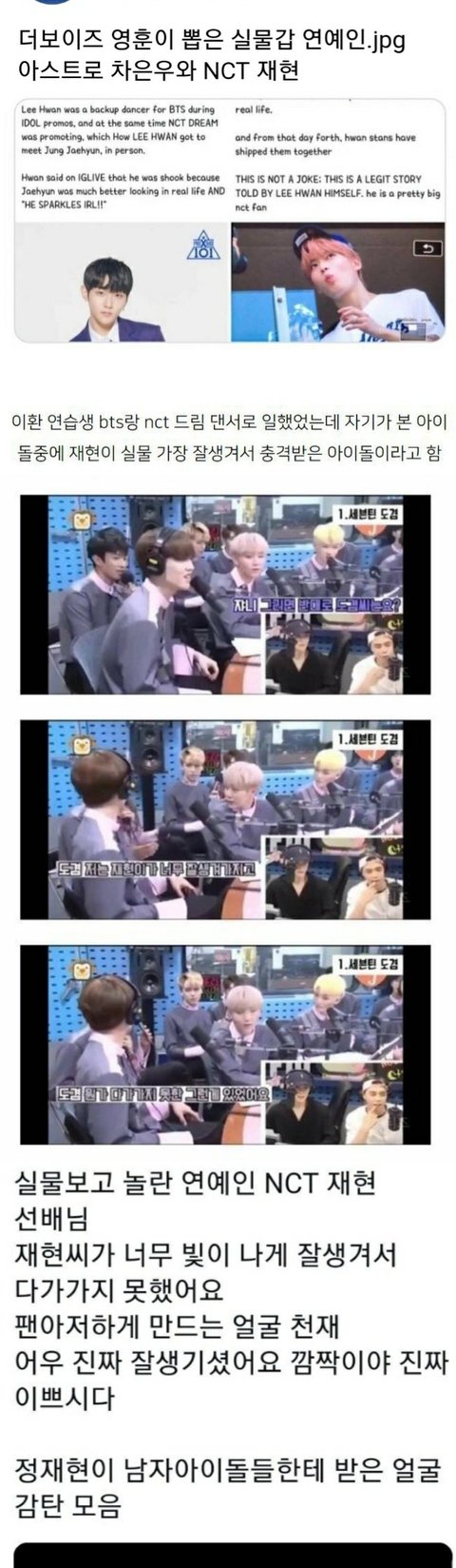 지성 ; 진짜 빈말이 아니라 재현이 형 들어오는데 얼굴이 진짜 너무 잘생겨서 깜짝 놀랐어요