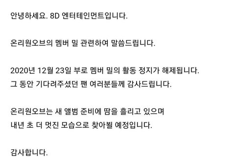 온리원오브 밀인데 그룹내 규칙위반으로 활동중지됐다가 오늘 사과문뜨고 영상에서 갑자기 삭발하고나옴 https://youtu.be/d7rRl1EX2Do 영상 이거임 별로 특별한내용은 없음 뭔일이야...?