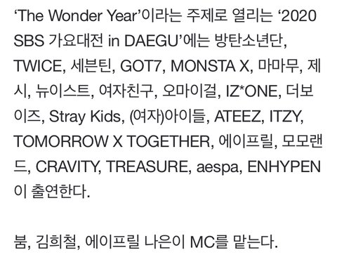 방탄소년단,트와이스,세븐틴,갓세븐, 몬스타엑스, 마마무,제시,뉴이스트,여자친구,오마이걸,아이즈원,더보이즈,Stray Kids,(여자)아이들,ATEEZ,ITZY,TXT,에이프릴,모모랜드,크래비티,트레저,에스파, 엔하이픈 출연