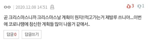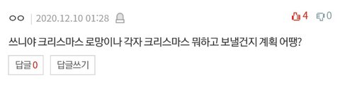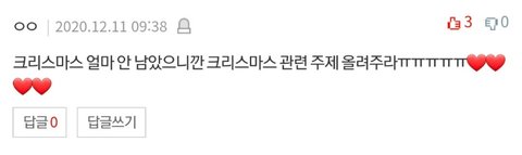 나는 썰이 없어서 계획을 말해보자면 배달음식 시켜먹고 보일러 틀고 이불속에서 따뜻하게 넷플로 크리스마스 관련 영화도 보고 캐롤 들으면서 인터넷 쇼핑할려고!!ㅎㅎㅎ 그나저나 타지역은 모르겠는데 우리지역은 올해도 화이트 크리스마스가 아니여서 좀 아쉽다ㅠㅠ