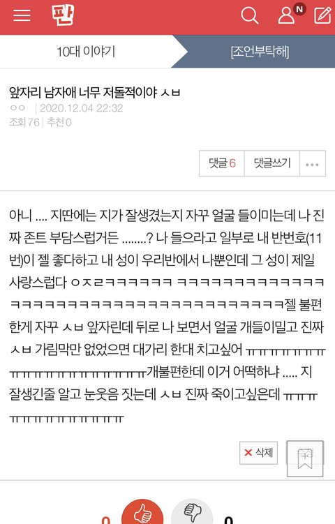 그래 ... 다행스럽게 이젠 학교를 거의 안가서 볼 일은 없다만 ..... 나도 정색하고 꺼지라하고 처음으로 남자애한테 욕도 해봤어 근데 걘 ㅋㅋㅋㅋㅋㅋㅋㅋㅋㅋㅋㅋㅋㅋㅋㅋㅋㅋㅋㅋㅋㅋㅋㅋㅋㅋㅋ”터프하네~” ㅇㅈㄹ 진짜 죽이고싶고 남자애고 키도 쫌 커서 한대 칠수도 없고 ㅅㅂ 걍 피하는게 상책이라서 __고 개피했는데 어제 이브 저녁에 학교끝나고 이제 끝이다 싶어서 후련하게 집가려는데 나 잡고 고백함 “쓰니야 솔직히 이거 다 너 좋아서 한 짓이고... 나 너 진짜 좋아해” 이러는 거야 ... 몰라 ㅅㅂ 진짜 진심인거 같아서 극혐지수가 조금 사그라 들긴 했는데 .......이거 받아줘야 해 .....? 진심으로 말하는데 욕박기도 그렇고 거절도 그렇고 ㅠㅠㅠㅠ 생각해보고 말하라 했는데 전화해야되나 ....? 제발 도와줘 ㅠㅠㅠㅠㅠㅠㅠㅠㅠㅠㅠㅠㅠ