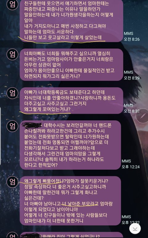첨부사진이구요. 읽어보시고 객관적으로 정상적인 엄마인지판단해주세요. 개인적으로 제가 이걸 처음 봤을 때는 애들같아서그냥 웃기고 어이가 없었습니다. 돈에 미친거처럼 보였어요.솔직히 미안하다 한마디도 안쓰여 있을줄 저는 상상치도못했습니다. 자신의 잘못이 없다고 쓴거라고 생각해요 저는글의 요지는 결론적으로 '제'가 잘못한거죠.아니 부모가 대판 싸우고 이혼한 모습을 본 저는부모 사이와 관계가 없는게 맞는건가요? 궁금합니다.전 이해가 되지 않기 때문입니다.저도 낳아지고 정신적으로 피해를 본 피해자라고 생각하는데..진짜 정신적으로 너무 힘들어서 용서하려고도 해봤습니다.근데 아버지라는 사람이랑 억지로 옷사러 갔을 때직원들한테 말하는거 듣는 순간 사람은 고쳐쓰는거 아니라고확신이 들 수 있었습니다. 이 부분에서만큼은 가게한 어머니에게아주 감사해야할 따름입니다. 조금이라도 흔들릴 뻔한 마음아주 확실하게 잡았으니까요ㅋㅋㅋㅋㅋㅋㅋ아프신건 면역력이 좀 약하셔서 포도상구균으로 시력저하 하신거랑 허리디스크 한 번 수술하신 적 있으시네요.잘 놀러가시고 합니다. 못움직이시는건 아니에요.살아오면서 원하는거를 못사준다고 불평하지도 않았고요구하지도 않았습니다.자식의 마음을 알려고 노력하지 않는 모습을 보고그냥 부모가 아니고 가정주부라고 생각하게 되었습니다.물론 잘해주신부분도 있습니다.물질적으로 지원은 해주셨다는 겁니다. 옷이나 밥 등 말이죠.이제와선 어머니고 아버지고 끼리끼리 만났다고 생각이듭니다.낳아주고 길러주면 다 부모인걸까요.개인적으로는 그렇게 생각 1도 안합니다.제가 멀어지려는게 정확힌 연락을 끊는 행동이 패륜아인걸까요.저는 저를 낳아준 분들을 앞으로 도와줄 마음이 단 1mm도 존재하지 않습니다. 내로남불은 싫기에 저도 20살이 되어 독립하고 도움받을 생각 없습니다. 저는 수많은 고민 끝에 이 부모랑은 멀어져야 제 자신이 행복할 것이라고 확신이 들었습니다.주에 부모 버린 자식이라고 비난 받더라도 멀어지고 싶습니다..없더라도 좋은 친구들을 만났고, 좋은 선생님을 만난 덕에저는 자살충동을 이겨냈던 것 같습니다.친구들과 선생님들에게는 부담스럽겠지만 곧 저의 친구이자부모역할을 해주는 고마운 사람들입니다.이런 확신이 있음에도 고민이 드는 이유는 부모 주변분들이 저를 이유불문하고 도와주신건 사실이기에 그 분들에게 작게나마 은혜를 갚지 않는다는 것이 마음에 걸립니다. 너무 죄송한 마음이 큽니다.전 어떻게 하면 좋을지, 저와 비슷한 상황을 겪어오신 분들은 조언을 해주시면 감사드리겠습니다.아니신분들은 이 글을 읽고 드는 생각들을 댓글로 달아주시면감사드리겠습니다. 올려주신 글들 다 읽어보고 생각을 정리하고싶거든요.글로 쌓여왔던것들을 토로하니 조금이나마 위안이 됩니다.복수의 최고의 방법은 성공이라고저의 부모라는 사람들에게 제가 자식을 키웠을 때훨씬 더 잘키울 수 있음을 보여드리곤 싶긴하네요지금 당장 키워도 저는 부모보다 잘 키울 자신이있네요.말이 길었네요. 긴 글 읽어주셔서 정말 감사드립니다.