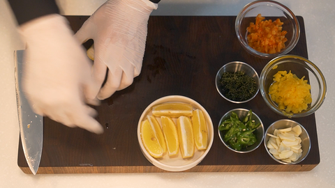 다음은 굴 위에 올려줄 마늘, 청양고추, 파프리카, 바다포도,레몬을 손질해 줍니다