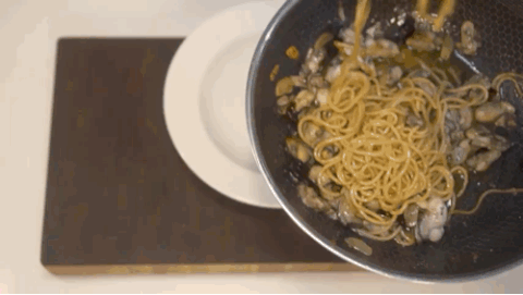 노릇노릇 마늘이 익어갈쯤 삶은 면을 넣고, 굴을 넣고 볶아주다가 면수를 한 국자 넣고 소금넣으면 끝!
