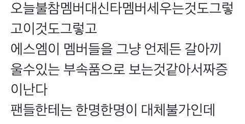 항상 우리가 그냥 화내고 피드백 요구해도 무시하고 지나가는데 제대로 된 피드백 좀 해주면 좋겠다 소비자를 진짜 그냥 돈나오는 기계 마냥 생각 하는 것 같고 버블이라던지 좋은 것도 많지만 일단 오늘 비욘드 솔직히 44000원까지는 아니라고 봄 일단 너무 끊겼고(안끊기는 사람들도 있긴 했다지만) 윈윈이... 말 안해도 알겠지? 그리고 코디 진짜 몇년간 말해도 왜 안듣는걸까 그리고 말도 안되는 스케줄, 몇 멤들 고정팀, 멤버들 건강, 체제(무환학장이 원래 정해진 체제인거 알고 좋아했다지만 정도가 있지 진짜 이러다가 우리 도시돼) 등등 버블 같은경우에도 좋긴한데 그것도 꽤 비싼돈이고 요즘 서버가 너무 말도 안됨 답장도 안돼 심지어 채팅도 잘 안떠 유출로 보는 것도 아니고 내돈주고 보겠다는데 제대로 못보는게 너무 짜증나고 억울함 나같이 이렇게 불만 얘기하면 불만 있으면 그냥 안보고 안사면 되는거 아니냐고 하는 사람들도 있을텐데 완전 이상적인걸 요구하는것도 아니고 너무 기본적인것도 제대로 안하니깐 화가나는거임 소비자가 지불한 값만큼 제대로 된 서비스를 제공해야하는게 당연한거 아닌가? 그냥 본인들이 뚝딱 찍어낸거에 필요한 값 요구하면 우리가 다 돈을 내뱉길 바라면 어떡해 여기에 뭐 화낸다고 해서 달라지는거 없겠지만 선배돌부터 좋아했어서 원래 실망스러운점이 많긴했지만 요즘따라 더더 실망스럽고 에스엠이 제대로된 피드백을 해줬으면 좋겠음 너무 횡설수설 화가나서 얘기하긴 했는데 나만 이렇게 느끼는거 아니라고 생각함