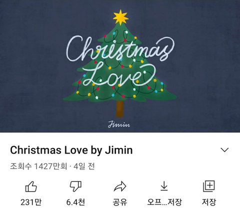 지민의 자작곡 '크리스마스 러브'(Christmas Love)가 25일 1000만 뷰를 넘기며 한국 유튜브 오디오 영상 역대 최단 신기록을 세우고, 28일 현재 1400만 뷰를 넘어서며 한국 신기록 행진 중이다.