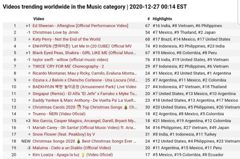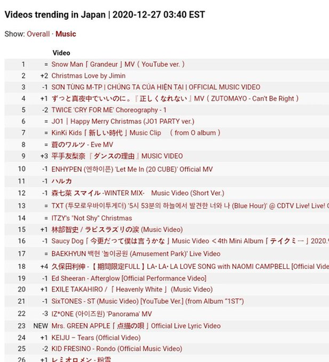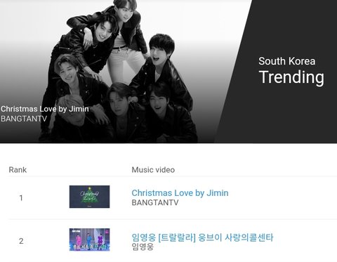 같은 날 미국, 프랑스, 독일 등 무려 54개국 인기 동영상에 트렌딩된 '크리스마스 러브'는 한국을 포함 3개국 1위, 일본 2위를 비롯해 상위 10위 안에 총 33개 국가가 포함되는 강력한 음원 파워를 보여주고 있다.