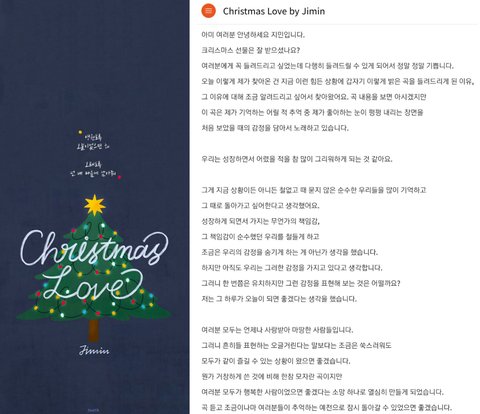 지민은 자작곡 '크리스마스 러브'를 팬들에게 선물하며 진한 감동을 선사함과 동시에 싱어송라이터로서 음악적 역량을 입증, 대중성까지 인정받으며 연일 기록 행진을 이어가고 있다.