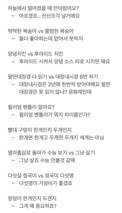 +) 밸런스게임 ‘물 벌컥벌컥 마시기vs벌크업하고 물마시기’ 나왔는데 둘 다 중요하다면서 하루 2리터 이상 꼭 마시라 그러고 ‘팔만대장경 읽기vs대장내시경하기’는 대장내시경은 2년에 한 번씩 해줘야되고 팔만대장경은 문화재라 못읽지 않냐 그럼