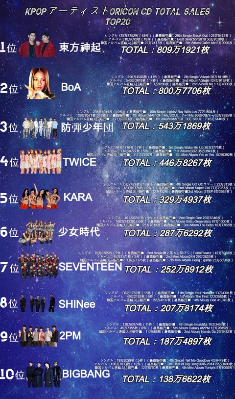 싱글 475만 8752장(48작)(최고 판매량 : 29th Single Break Out! 28만 9412장)앨범 310만 692장(18작)(최고 판매량 : Best Selection 2010 56만9530장)한국앨범 직수입 총판매량 23만 2477장(최고 판매량 : 6th Album Catch Me 6만 9090장)