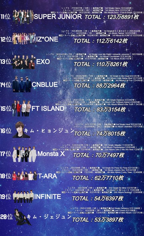 싱글 : 53만 8347장(7작)(최고 판매량 : 6th Single Alligator 11만 8327장)앨범 : 11만 1286장(2작)(최고 판매량 : 2nd Album Phenomenon 5만 6244장)한국앨범 직수입 총 판매량 : 5만 7864장(최고 판매량 : 2nd Album Take.2 We Are Here 1만 907장)