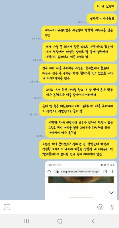 너무 잔인한 꿈이라 그 날 친구한테 알렸어. 나는 고어물 아예 못보고 액션 영화도 싫어하는데 왜 이런 꿈을 꿨지 하고 대수롭지 않게 넘겼어.