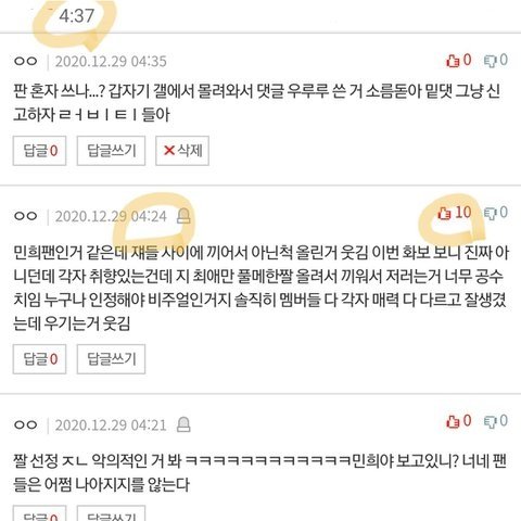이 사진 보면 새벽 4신데 10분만에 베플 추천수가 10으로 늘어나지 가능한 일일까? 더더욱 그 글쓰니가 ㅁㅎ팬이라고 주장하고 ㅁㅎ끼워판다고 하는 댓글에 ㅁㅎ팬이 몰려와서 바로 추천 10개 박는다는 것도 말이 안 되지 그 글에 타멤까는 댓들 다 갤련들이 팬코하면서 악개짓하는 거니까 우리 탈판하지 말자 데뷔초때 갤련들이 와서 하도 견제해서 다 탈판했었는데 다시 사람들 늘어나고 팬톡 조금씩 활성화 되니까 또 견제하네 이번엔 탈판하지말자
