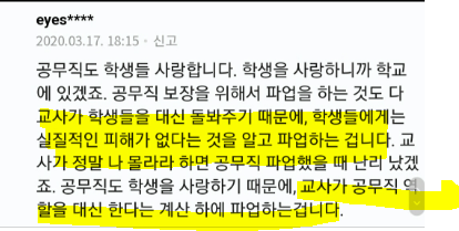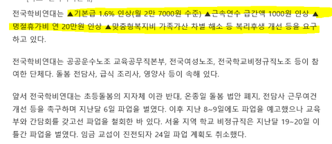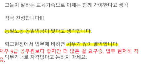 올해만 학교 공무직은 3번이상 아이들 볼모로 파업했고 그 결과 공무원 이상의 임금 인상(공무원 0.9%인상)과 명절 휴가비만 20만원, 총 40만원을 인상함. 그래서 파업안하냐? 아직도 파업은 진행중이고 더 달라 떼쓰는 중! 이미 이들은 9급 공무원들과 초임 교사보다 많은 월급을 받고 있음
