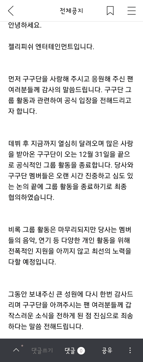 2년동안 활동도 없었고 멤버들보고 본가내려가라고 해놓고 이제는 우리 볼 일 없으니 숙소에서 짐빼라고 했음. 진짜 잔인한 놈들.....