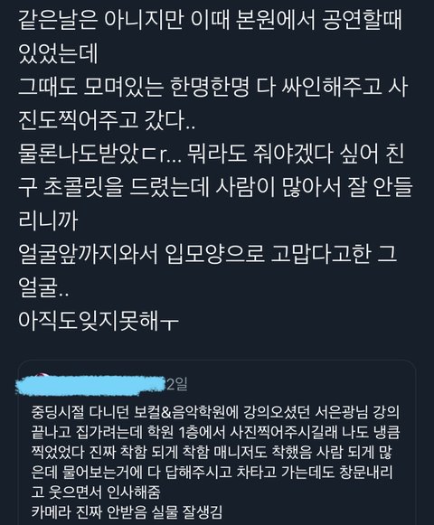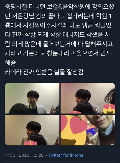 나 서은광님이랑 같은 아파트에 같은 동 사는데(믿거말거) 전에 아침 일찍 미팅 때문에 새벽 여섯시였나 일곱시에 출발해서 엘베에서 토스트 먹고 있었음 (내가 늦잠자서 부랴부랴 나오느라 챙겨나온거야 !! 요즘 마스크 때문에 이런 부분에 민감할 것 같아서 미리 말할게 그리고 담부턴 조심할게 ㅠㅠ) 근데 XXXXXXXXXXX층(혹시 층 예측할까봐 ..)에서 멈추길래 냄새나면 어쩌지 이러면서 마스크 다시 올리고 토스트 다시 감싸서 주머니에 넣으려할 때 서은광님이 탔단말이야 솔직히 마스크 써도 연옌을 누가 못알아봐 딱 보고 헉소리 내면서 나도 모르게 안녕하세요 이럼 .. 더 아는 척 하고 싶었는데 부담스러우실까봐 조용히했음 근데 은광님이 엄청 친절하게 인사 받아주시고 아침 드시고 계셨던 거 아니냐고 드셔도 된다고 이러셔서 아 괜찮아요 냄새날까봐 .. 이랬더니 아 ! 전 괜찮아요 !! 아침 거르면 안돼요ㅠㅠ 꼭 드세요 !!! 이러시면서 매니저분 차타러 먼저 나가심 눈만 보긴 했지만 사진 진짜 안받으셔 !! 실물 진짜 개잘생겼어 팬만 안다는 그 느낌 알 것 같다 진짜 ...