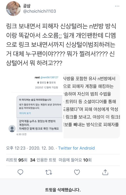 뭐가 문젠지 잘 모르겠는데... 엔번방이 썼던 수법을 이야기못할것도 없고 조심하자고 상기시키는건 나쁠게 없잖아 피해자를 욕하는것도 아니고.. 난 이글보고 링크 진짜 조심해야겠다 알게됨