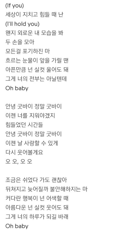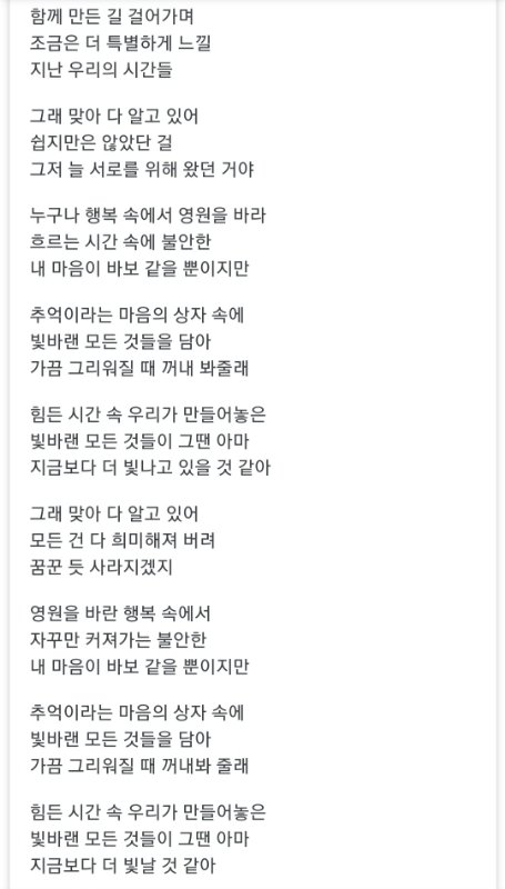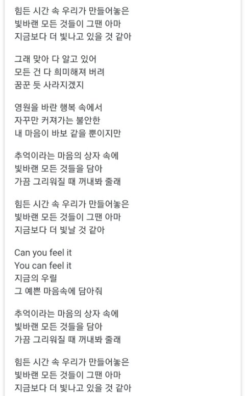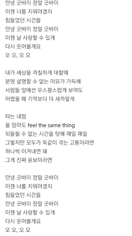 그리고 이건 번외로 보미 미공개 솔로곡인데 직접 작사, 작곡한 노래임. 알앤비댄스곡인데 가사보면 알 수 있듯 힘들던 예전에서 다시 일어서는 가사야.