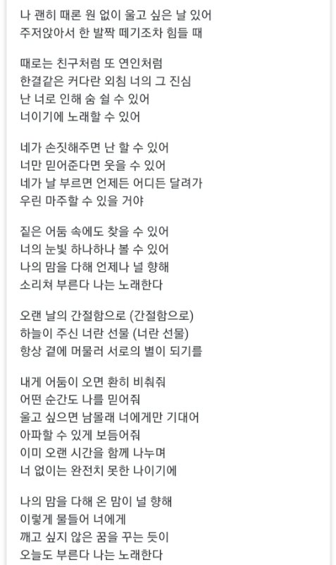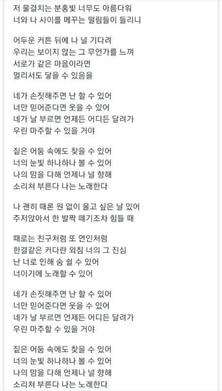 이건 판다들 공식 눈물버튼 2016년도 팬송 '네가 손짓해주면'. 이것도 초롱이가 작사한 거임. 16년도가 오랜 공백기 이후에 정규컴백인데도 성적이 부진했던 시기라 판다들이 힘들어했는데 그때마다 멤버들이 이렇게 지탱해줬음.
