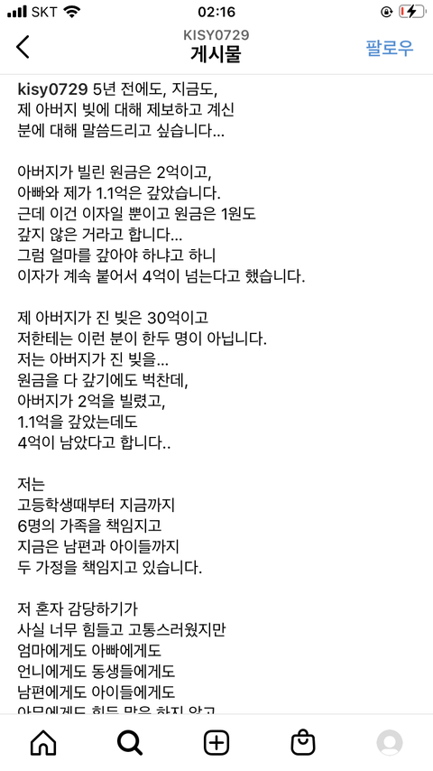 여기 댓글이 다들 홍영기가 불쌍하다 이러는데 유튜버 구제역에 홍영기 폭로에 피해자분 인터뷰도 있어...홍영기가 어버지의 빚을 갚기 위해 노력 했다고 하지만 한번도 노력한적 없고 피해자 한테 한번 연락해서 명예회손으오 고소하겠다고 까지 했대. 아버지가 빌린돈이라서 홍영기가 죄가 없다고 하면 마이크로닷도 똑같지. 그 돈으로 홍영기네 가족 그리고 홍영기가 먹고 살았으면 갚는게 맞아.홍 아버지가 2억을 빌리고 전세금 빼서 갚겠다고 집으로 찾아오라고 했는데 홍영기 가족이 이사간 뒤였대.(농락오졌지..ㅜ)그리고는 매달 30만원 담배값 아껴서 갚겠다고 해놓고 그것 조차 갚지 않았대. 피해자따님분은 그렇게 갚아달라고 애원하면서도 아버지랑 관계없다고 하는 홍영기 sns에 아버지 사진과 가족들이 화목하게 맛있는걸 먹고있는걸 보는 것도 고통스러웠대.자기가족들은 큰집에 얹혀 살고 따님은 아르바이트고 뭐고 돈 갚으려고 비참하게 살았고 홍영기네 가족은 그걸로 잘먹고 잘살았던 거야.. 내 아버지가 남에돈 뺏아서 그렇게 사기쳤으면 나는 내 아버지 빚은 안갚아도 손절할거임. 근데 아버지랑도 잘 지내면서 돈은 안갚겠대...게다가 수십억을 벌어들이면서 그걸 또 세금을 안내겠다고 탈세를 해서 벌금이 5억이야.... 근데 또 홍영기는 sns로 동정심을 얻어 책임을 회피 하려고 해.게다가 피해자분들한테 홍영기 시녀들이 엄청나게 막말하고 악플을 달아서 피해자는 더큰 가해를 받고 있어.우리 사기꾼 편을 들어주진 말자.저 빚투가 2015년도에 터진거고 홍영기가 그때도 그 빚 갚기 위해 노력한다고 언플만 했지 노력은 1도 안했대.쇼핑몰로 수십억을 벌었는데 겨우 1억을 갚았다고???홍영기가 지금이라도 아버지 한테 4억을 빌려드리고 그돈을 갚고 아버지 한테 매달 30만원씩 받으라고 하면 될거 같아.