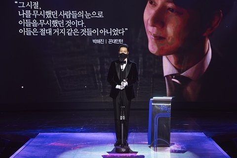 최우수 연기상 수목 미니시리즈 부문을 수상한 배우 김응수는 "꼰대인턴을 하는 동안인 2~7월 단 한 번의 트러블도 없었다. 오직 코로나19만이 문제였다"며 "팬데믹 상황에서 고통 받고 있는 분들, 현장에서 고군분투 싸우고 계신 의료진들을 성원하고 싶다"고 말했다.