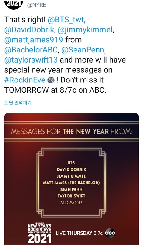 방탄 2021 New Year’s Rockin’ Eve 출연 확정.