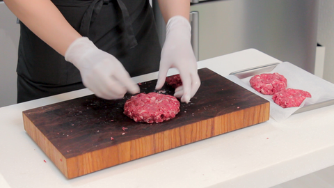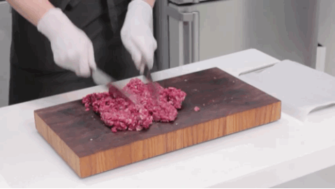 먼저 한우 안심과 등심을 1000번 다져서 만든 패티를 만들건데... 팔이 떨어져 나갈 수 있으니 조심~.,~