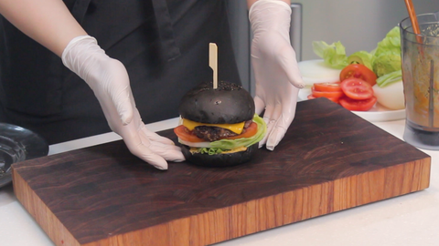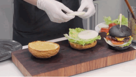 먼저 오징어 먹물 번으로 만든 버거가 먼저 완성됐습니다!