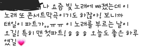 덕질하면서 벅차오르는 마음을 인☆ 비계에 혼자 적어놓는데 10월쯤에 애들 루키즈때 ㅇㅅ2014에서 에이쵸티님 빛 부른거 한창 빠졌을때가 있었는데 그때 태일이가 첫 소절 불러줬으면 했거든 와... 근데 그게 이뤄졌어!!!!! 2021년 첫 날부터 기뷴 좋다!! 별거 아닐 수 있지만 ㅎㅎㅎ 태일아 사랑해♡