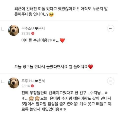 98즈 아이돌 친목! 사진은 여자친구 신비랑 수진이야ㅎㅎ우주소녀 은서, 여자친구 신비 엄지랑 (수지는 누군지 모르겠다ㅠㅠ) 단톡방도 있어! 이름은 청바지(청춘은 바로 지금) 언제 한번 신비랑 수진이랑 스춤 찍는 그날까지 존버ㅠㅠ