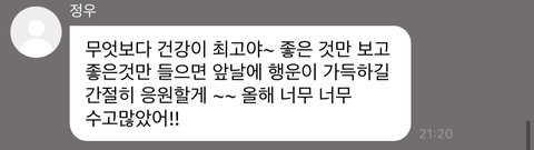 이게 그 연말에 정우 버블 했을때 걍 내가 저렇게 보냈는데 서버 난리나서 누락돼서 첫번째 사진 이후로 바로 버블이 두번째 사진으로 왔단말임? ㄹㅇ 혼자 속으로 감동먹음