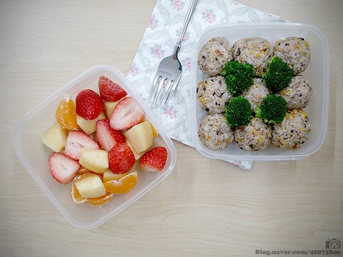 (참치마요 주먹밥, 데친 브로콜리, 과일 샐러드)