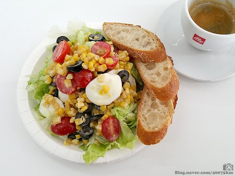 샐러드 퍼묵퍼묵 하다가 탄수화물이 그리워지면 콘브레드 한 입 베어물고, 그러다 목이 막힐 듯 하면 수프를 마셔줍니다.