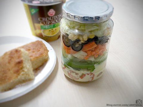 집에 있는 재료를 썰어서 유리병에 차곡차곡 쌓기만 하면 되니까요. 겉보기에도 예쁘고 소스가 흐를 염려도 없으니 좋습니다.