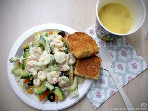 (새우, 아보카도, 올리브, 당근, 오이, 양상추, 머스타드마요 샐러드, 콘브레드, 인스턴트 옥수수 수프)