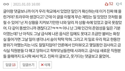 댓글로 학교측에서 애들 다 돌려보내면 안되냐고 하는데 일단 그때 학교 상황 자체가 패닉이였어. 그리고 그런 상황되니까 배아픈 애들도 이성 잃고 그래서 학교 밖에 있는 상가 화장실 같은 곳 갈 생각 자체를 못했던 것 같음...
