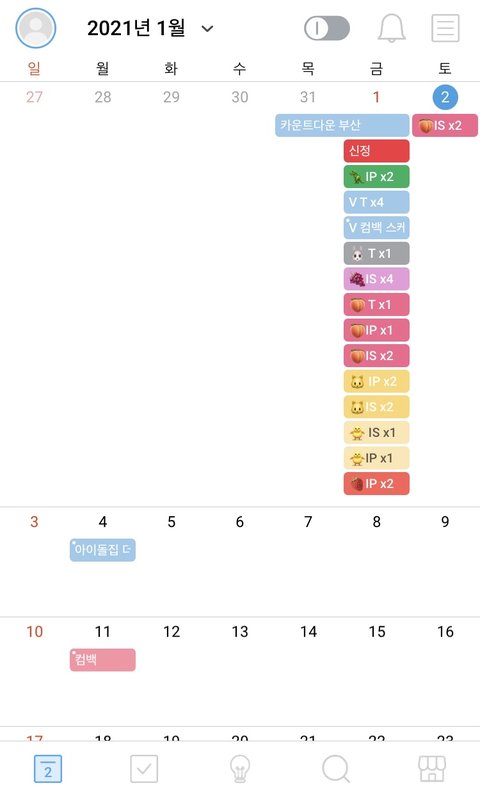 나 올해부터 스케쥴러 빡시게 써보려고 하는데 1월 1일에 혹시 내가 빼먹거나 틀린 고 있으면 좀 알려주랑 참고로 T는 트위터 IP는 인스타 피드 IS는 인스타 스토리야! 또 하늘색 일정은 공식이나 단체 스케줄이궁
