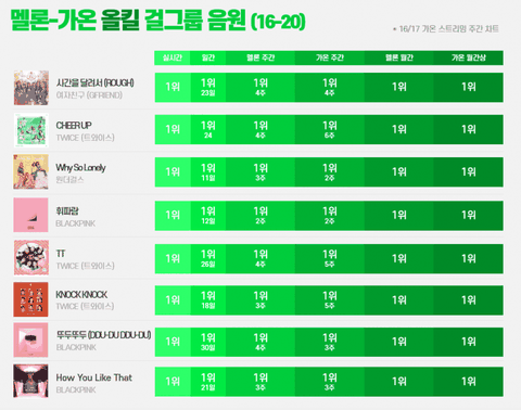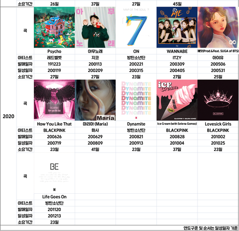 2010종합 차트만 봐도 트와이스4곡 불핑3곡 여친2곡 레벨1곡임.. 싸이코도 2019년도에 나온 곡들 동등하게 52주차 누적 환산시 연간 10위가아니라 24위고(중후반추이 매우 약하다는거임)