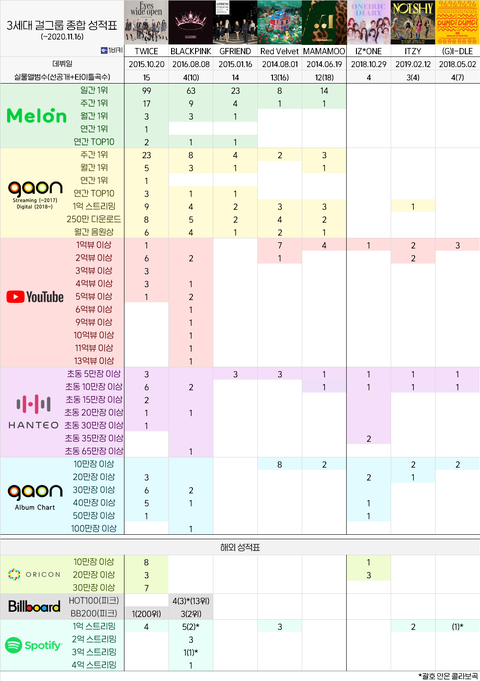 판에서만 유독 레벨 음강이란 수식어 자주붙고 팩트만 말해줘도 억까라고 지랄들하는거 진짜 이해안감 없던 정보를 부풀려서 말한것도아니고 ;; 오히려 여친이 까였으면 많이 까였지 허구언날 음원 망햇다그러고. 근데 여친보다 연간 잘 뽑아낸 그룹 없어 ㅋㅋ.. 3세대 월간 1위한 그럽이 3팀밖에없는디