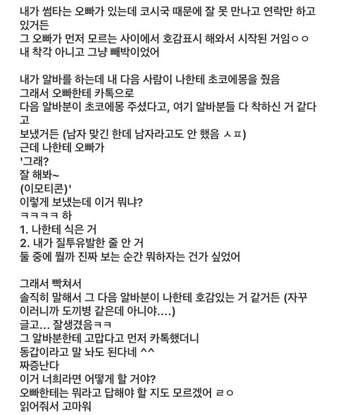 덧글 반응이 대부분 초코에몽한테 갈아타라고, 오빠가 머리 쓰는 거 같은데 좋은 남자 아닌 거 같다고 그러더라고