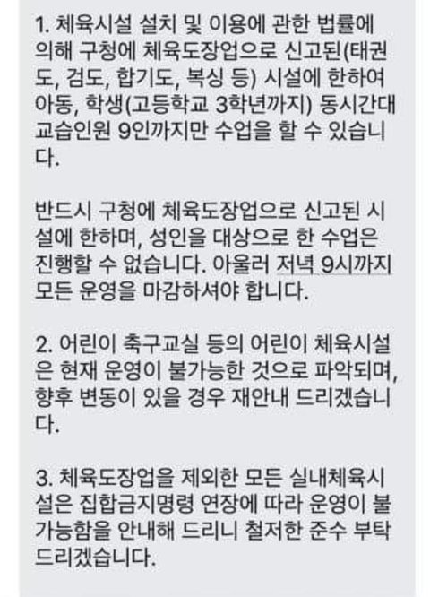 체육도장업은 감염되지 않지만 실내체육시설은 감염됩니다