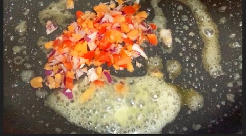 버터에 다진 야채를 소금과 후추로 밑간을 하고 야채가 어느 정도 익으면 밥을 함께 볶아준다.