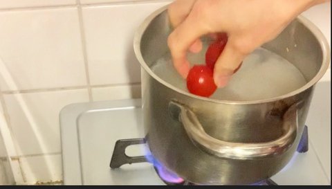 냄비물이 끓으면 다시와 열십자로 칼집을 낸 토마토를 함께 넣고 끓여 주고 많이 끓어오면 된장을