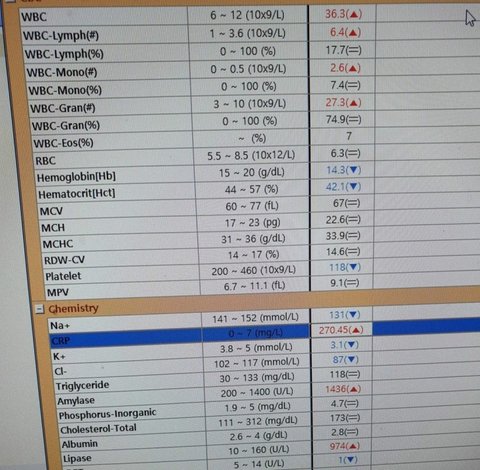 검사한건데 난 봐도 잘 모르겠지만 췌장염 검사고 정상수치에서 많이 벗어났나봐