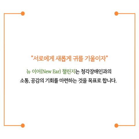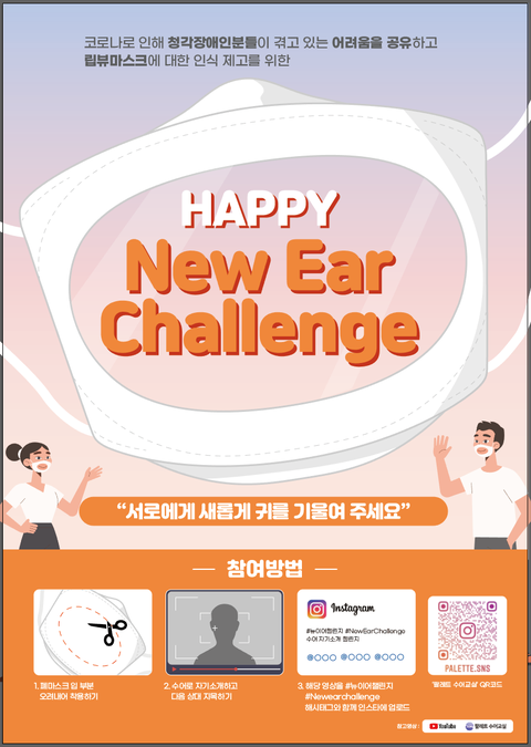 ‘뉴이어챌린지(new ear challenge)’는 ‘서로에게 새롭게 귀를 기울여주세요’라는 의미를 지닌 sns 챌린지입니다. 마스크가 입 모양을 가려 소통에 더욱 어려움을 겪게 된 청각장애인 분들을 위해 입 모양이 보이는 ‘립뷰마스크’가 제작되었지만, 낯선 모습 탓에 그에 대한 시선은 차갑기만 합니다. 뉴이어챌린지에 참여하고, sns에 이를 공유하는 과정을 통해 보다 많은 사람들이 청각장애인 분들이 당면한 문제를 인식하고, 나아가 립뷰마스크에 대한 거부감을 해소할 수 있을 것입니다.